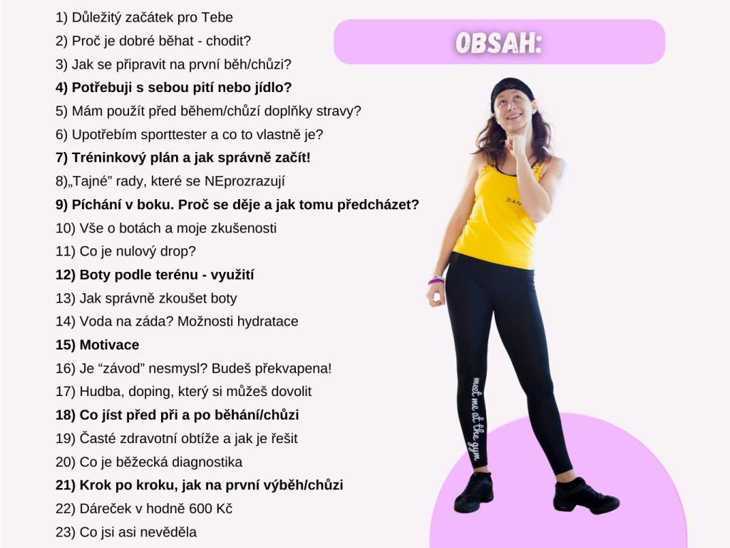 Vše Ti vysvětlím stručně a jasně, abys nedělala zbytečné chyby, pohyb si užila a ❤️ bavilo Tě to. V e-booku najdeš i tréninkový plán.